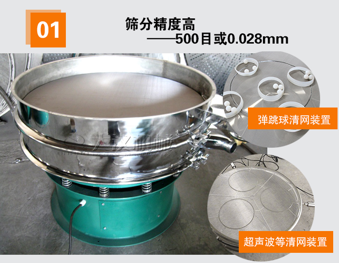 旋振篩篩分物料范圍廣,500目或0.028mm的顆粒及粉狀物料均可以高效篩分,另外,我們廠家生產的旋振篩設備還設置有彈跳球、超聲波等清網裝置,針對有些精細粉狀物料,我們的旋振篩設備可以很好地降低粉狀物料因靜電,比重輕等因素造成的堵塞網孔的現象。