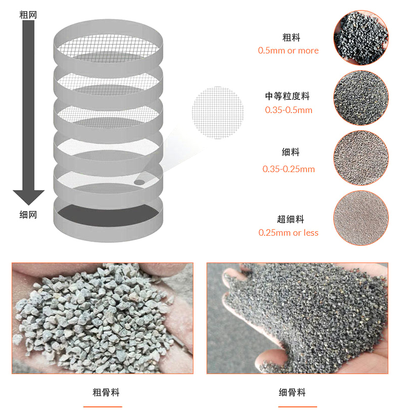 粒度分級:根據篩孔或篩網的大小,物料會被分為不同的粒度級別。較細的顆粒會通過較小的篩孔,而較粗的顆粒會被擋在較大的篩孔上。