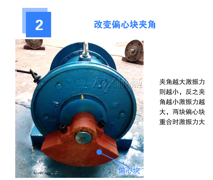 轉軸的兩端面上都刻有基準線,旋松兩側外偏心塊壓緊螺栓,兩側外偏心塊同向轉動,使軸上刻線對準外偏心塊上的激振力標尺刻線,調整所需激振力,擰緊外偏心塊壓緊螺栓,裝上振動電機的防護罩就可以了。