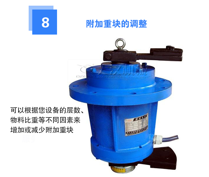 在上、下重錘的一側裝有附加重塊,它的作用是增減篩機的激振力。您可以根據您設備的層數、物料比重等不同因素來增加或減少附加重塊。