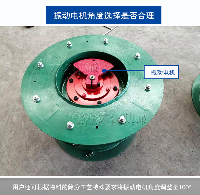 超聲波旋振篩振動電機上下兩端的偏心塊角度越小,物料在篩面上運轉向外散開的越快,角度變大,物料向外散開的越慢。一般情況下振動篩出廠時電機角度為45°,用戶還可以根據其物料的篩分工藝特殊要求將振動電機角度調整至100°,物料則向篩網中央集中。需要根據不同物料進行調整。