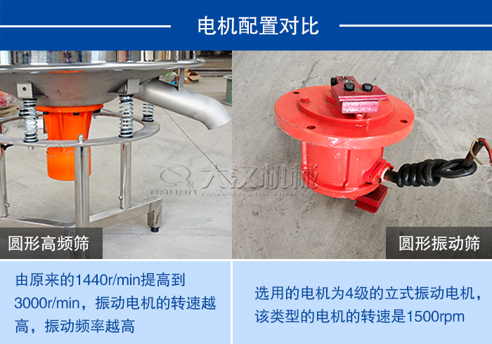 圓形高頻篩振動頻率由原來的1440r/min提高到3000r/min,振動電機的轉速越高,振動頻率越高,因此堵網情況大大減少。